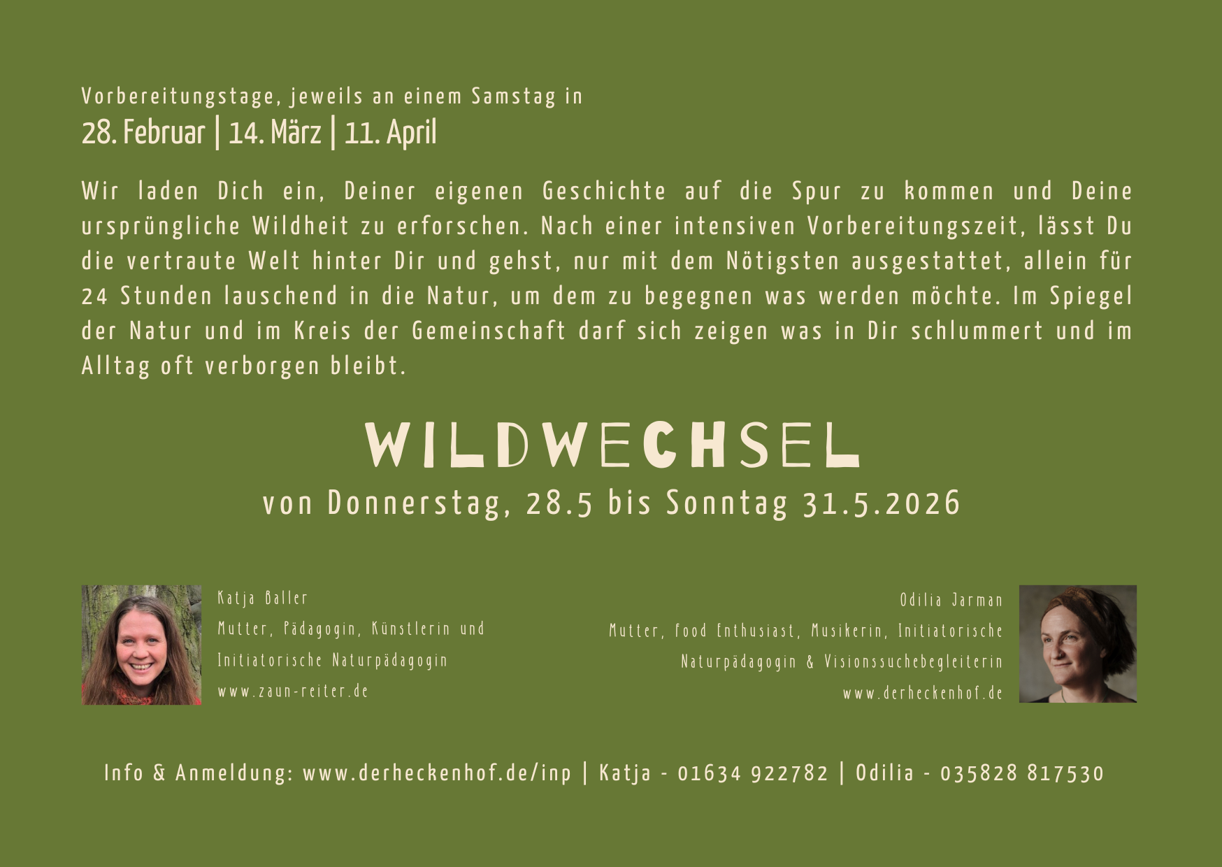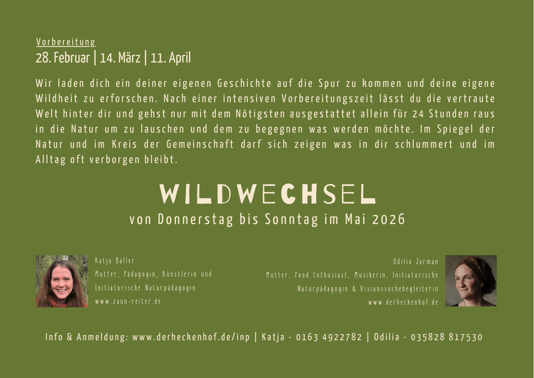 Wir laden dich ein, deiner eigenen Geschichte auf die Spur zu kommen und deine eigene Wildheit zu erforschen. Nach einer intensiven Vorbereitungszeit lässt du die vertraute Welt hinter dir und gehst nur mit dem Nötigsten ausgestattet allein für 24 Stunden raus in die Natur um zu lauschen und dem zu begegnen was werden möchte. Im Spiegel und der Gemeinschaft der Natur wird sich zeigen was schon in dir ist, im Alltag aber oft verborgen bleibt.